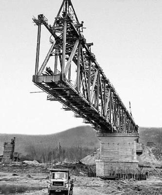Строительство железнодорожного моста через р. Лену на западном участке БАМа. Иркутская область.