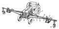Сцепка сельскохозяйственная, приспособление для агрегатирования с трактором нескольких с.-х. машин в целях рационального использования тяговой мощности трактора и увеличения производительности агрегата. С. бывают универсальные, специального назначения, прицепные, полунавесные и навесные (универсальная навеска). Универсальная прицепная С. (рис. 1) применяется для составления агрегатов из трактора и прицепных машин. Выполняется из двух или трёх шарнирно скрепленных (для лучшей приспособляемости к рельефу поля) и опирающихся на колёсный ход брусьев и оборудуется удлинителями. Машины и удлинители прикрепляют к брусьям хомутами, перемещением которых обеспечивается правильность взаимного расположения машин или орудий в агрегате. Для присоединения к трактору С. имеет сницу. Специальные С. обычно не имеют ходовой части и составляются из звеньев, соединяющих прицепные машины между собой (например, у Пахотного комбинированного агрегата). Полунавесные С. (рис. 2) служат для составления навесных агрегатов из 3 навесных машин шириной захвата каждой от 1,8 до 2,8 м. Одну машину навешивают на навесную систему трактора, а две — на боковые механизмы навески С., по устройству аналогичные навесной системе трактора. Механизм навески снабжен гидроцилиндром, работающим от гидрораспределителя трактора и используемым только для подъёма навесной машины. Опускается машина под действием собственной массы. Правильная установка машин с различной шириной захвата по фронту достигается перемещением каретки механизма навески по брусу С. Универсальная навеска (рис. 3) служит для навешивания на тракторы малой и средней мощности звеньев борон, которые присоединяют к стойке и кронштейнам навески при помощи шарнирной тяги, двух длинных и одной короткой цепей. Для навешивания звеньев борон различной ширины захвата кронштейны навески перемещают по брусу. На брус С. можно навесить 3 звена зубовой и 2 звена сетчатой борон. Длину бруса С. можно увеличить, вставив в его отверстия с обеих сторон 2 трубы меньшего диаметра, к которым приварены кронштейны для навешивания по 1 звену зубовой бороны, составляя агрегат из 5 звеньев бороны.