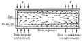 Тепловая труба, теплопередающее устройство, способное передавать большие тепловые мощности при малых градиентах температуры. Т. т. представляет собой герметизированную конструкцию (трубу), частично заполненную жидким теплоносителем (рис.). В нагреваемой части Т. т. (в зоне нагрева, или испарения) жидкий теплоноситель испаряется с поглощением теплоты, а в охлаждаемой части Т. т. (в зоне охлаждения, или конденсации) пар, перетекающий из зоны испарения, конденсируется с выделением теплоты. Движение пара от зоны испарения к зоне конденсации происходит за счёт разности давлений насыщенного пара, определяемой разностью температур в зонах испарения и конденсации. Возвращение жидкости в зону испарения осуществляется либо за счёт внешних воздействий (например, силы тяжести), либо под действием капиллярной разности давлений по капиллярной структуре (фитилю), расположенной внутри Т. т. (чаще всего на её стенках). В связи с тем, что Т. т. с капиллярной структурой для возврата жидкости могут работать независимо от ориентации в поле тяжести и в невесомости, наиболее распространён именно этот тип Т. т. Эффективная теплопроводность Т. т. (отношение плотности теплового потока через Т. т. к падению температуры на единицу длины трубы) в десятки тысяч раз больше, чем теплопроводность Cu, Ag или Al, и достигает ~107 вт/м К). Малый вес, высокая надёжность и автономность работы Т. т., большая эффективная теплопроводность, возможность использования в качестве термостатирующего устройства обусловили применение Т. т. в энергетике, химической технологии, космической технике, электронике и ряде других областей техники.