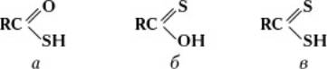 Органические Т. (тиокарбоновые кислоты) подразделяются на монотиокарбоновые — тиоловые (а) и тионовые (б), дитиокарбоновые (в) кислоты: