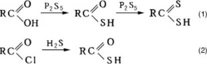 Монотиокарбоновые кислоты существуют в виде таутомерной смеси с сильным преобладанием тиоловой формы; производные известны для обеих форм. Т. (особенно простейшие) обладают сильным неприятным запахом. По сравнению с соответствующими карбоновыми кислотами, Т. — более сильные кислоты, в воде растворяются хуже, кипят при более низких температурах. Органические Т. получают главным образом взаимодействием карбоновых кислот с пятисернистым фосфором (1) или производных карбоновых кислот с сероводородом (2):