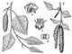 Рис. 2. Берёза бородавчатая: а — верхушка побега с плодущей серёжкой; б — ветвь с цветущими серёжками; в — мужское соцветие; г — женское соцветие; д — плод.