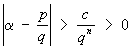 (с зависит только от a). Поэтому, если для заданного иррационального числа a можно указать бесконечное множество рациональных приближений, не удовлетворяющих приведённому неравенству ни при каких с и n (одних и тех же для всех приближений), то a есть Т. ч. Пример такого числа даёт: