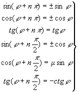 в первых трёх формулах n может быть любым целым числом, причём верхний знак соответствует значению n = 2k, а нижний — значению n = 2k + 1; в последних — n может быть только нечётным числом, причём верхний знак берётся при n = 4k + 1, а нижний при n = 4k — 1.