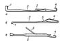 Трикотажная игла: а — язычковая; б — крючковая; в — пазовая; 1 — пяточка; 2 — стержень; 3 — язычок; 4 — крючок; 5 — чаша; 6 — движок.