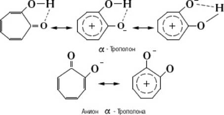Трополоны — производные окситропона. Энергия резонанса трополоновой системы составляет 126 кдж/моль (30 ккал/моль), дополнительная стабилизация вносится внутримолекулярной водородной связью (показана пунктиром):