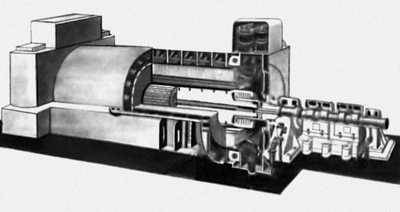 Т. атомных электростанций обладают некоторыми особенностями, связанными с тем, что пар, вырабатываемый в ядерном реакторе, имеет относительно низкие параметры, обусловливающие экономическую целесообразность применения турбин с частотой вращения 25 сек –1. Такая частота требует наличия двух пар полюсов на роторе Т. и позволяет выполнять сам ротор с большим диаметром (до 1,8 м). При этом размер поковки ротора ограничивается технологическими возможностями её изготовления (максимальная масса поковки достигает 140—180 т).
