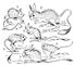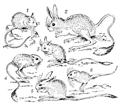 Тушканчики: 1 — лесная мышовка; 2 — большой тушканчик; 3 — земляной зайчик; 4 — мохноногий тушканчик; 5 — гребнепалый тушканчик; 6 — жирнохвостый карликовый тушканчик.