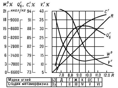 Рис. 1. Изменение рабочей влажности (Wp), теплоты сгорания (Qгб), содержания углерода (Cr), выхода летучих веществ (Vr) и отражательной способности витринита (R) с повышением степени углефикации углей (по И. В. Ерёмину, Э. М. Паху).