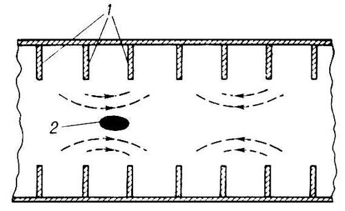 Рис. 12. Схематический разрез волновода с диафрагмами (1). Стрелками показано распределение поля, бегущего вдоль волновода; 2 — ускоряемый сгусток электронов.