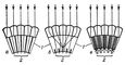 Рис. 2. Схема возникновения сетчатого изображения в аппозиционных (а), оптикосуперпозиционных (б) и нейросуперпозиционных (в) фасеточных глазах: 1 — отдельные омматидии с единым или разобщённым светочувствительным элементом, сложенным рабдомерами; 2 — аксоны зрительных клеток. Заштрихованы те светочувствительные элементы, на которые попадают параллельно идущие лучи света (показаны стрелками).