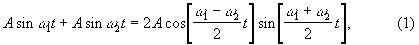 где w1 и w2 — соответственно угловые частоты двух накладывающихся гармонических колебаний (начальные фазы обоих колебаний полагаются равными нулю, т.к. они не играют роли в образовании Б.; играет роль только разность фаз между обоими колебаниями, которая всё время меняется от 0 до 2p).