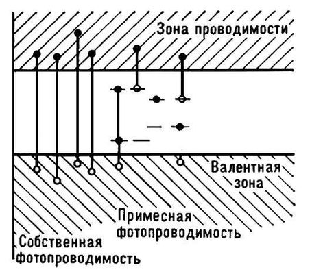 Фотопроводимость, фоторезистивный эффект, увеличение электропроводности полупроводника под действием электромагнитного излучения. Впервые Ф. наблюдалась в Se У. Смитом (США) в 1873. Обычно Ф. обусловлена увеличением концентрации носителей тока под действием света (концентрационная Ф.). Она возникает в результате нескольких процессов: фотоны «вырывают» электроны из валентной зоны и «забрасывают» их в зону проводимости (рис. 1), при этом одновременно возрастает число электронов проводимости и дырок (собственная Ф.); электроны из заполненной зоны забрасываются на свободные примесные уровни – возрастает число дырок (дырочная примесная Ф.); электроны забрасываются с примесных уровней в зону проводимости (электронная примесная Ф.). Возможно комбинированное возбуждение Ф. «собственным» и «примесным» светом: «собственное» возбуждение в результате последующих процессов захвата носителей приводит к заполнению примесных центров и, следовательно, к появлению примесной Ф. (индуцированная примесная Ф.). Концентрационная Ф. может возникать только при возбуждении достаточно коротковолновым излучением, когда энергия фотонов превышает либо ширину запрещенной зоны (в случае собственной и индуцированной Ф.), либо расстояние между одной из зон и примесным уровнем (в случае электронной или дырочной примесной Ф.).