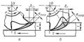 где z — число зубьев фрезы, n — частота вращения фрезы (об/мин). Глубина резания t (мм) при Ф. — толщина срезаемого слоя металла, измеренная перпендикулярно к обработанной поверхности. Ширина Ф. В (мм) — ширина обрабатываемой поверхности в направлении, параллельном оси фрезы. Существуют две возможные схемы Ф.: против подачи (встречное Ф.), когда в нижней точке контакта фрезы с обрабатываемой заготовкой векторы скорости резания и подачи противоположны (рис. 2, а), и по подаче (попутное Ф.), когда эти векторы совпадают (рис. 2, б), amax — наибольшая толщина срезаемого слоя металла; Y — угол контакта фрезы. При черновом Ф. обычно применяется вторая схема, при чистовом Ф. — первая. Площадь поперечного сечения слоя металла, срезаемого зубом фрезы, меняется в каждый момент времени резания и, следовательно, меняются и действующие на зуб силы. Равномерное Ф. может быть достигнуто при использовании фрез с винтовыми зубьями, работа которых характеризуется примерным постоянством площади поперечного сечения срезаемого слоя металла. Основное технологическое время при Ф.: