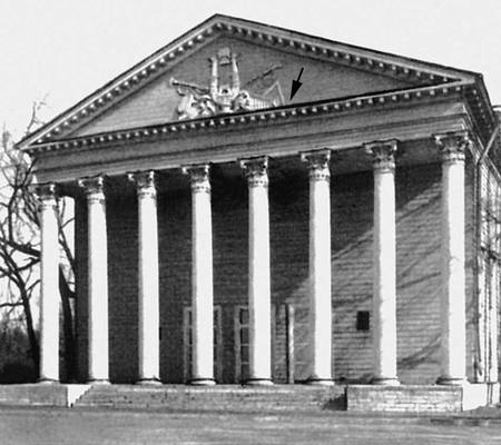 Фронтон (указан стрелкой) Каменноостровского тетра в Ленинграде. 1827. Архитектор С. Л. Шустов.