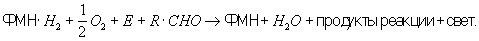 (Здесь ФМН — окисленная форма флавинмононуклеотида, ФМН · H2 — его восстановленная форма, Е — фермент люцифераза.) Бактерии испускают зелёный свет с максимальной длиной волны около 560 нм. Наиболее сложна система Б. у насекомых, например светляков. Их органы Б. испускают вспышки жёлто-зелёного света (около 560 нм.), вызываемые нервными импульсами. Кроме люциферина и люциферазы, для реакции Б. насекомым необходимы АТФ (см. Аденозинфосфорные кислоты) и магний. Энергия, освобождающаяся при гидролизе АТФ (см. Биоэнергетика), видимо, активирует люциферин-люциферазную систему и обеспечивает окисление люциферина с испусканием света. В отсутствии АТФ эта система не работает.