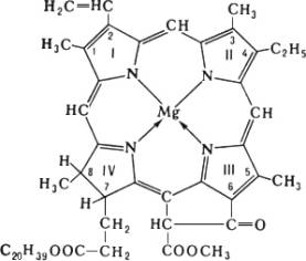 Хлорофилл (от греч. chlorós — зелёный и phýllon — лист), зелёный пигмент растений, с помощью которого они улавливают энергию солнечного света и осуществляют фотосинтез. Локализован в особых клеточных структурах — хлоропластах или хроматофорах и связан с белками и липидами мембран. Основу структуры молекулы Х, составляет магниевый комплекс порфиринового цикла; в IV пиррольном кольце к остатку пропионовой кислоты присоединён высокомолекулярный спирт фитол, который придаёт Х. способность встраиваться в липидный слой мембран хлоропластов.