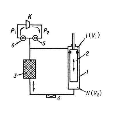 Рис. 2. Схема холодильно-газовой машины Джиффорда — Мак-Магона: К — компрессор; 1 — цилиндр; 2 — поршень-вытеснитель; 3 — регенератор; 4 — охлаждаемый объект; 5 — впускной клапан; 6 — выпускной клапан.
