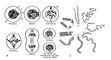 Рис. 1. А. Схема клеточного деления — митоза: я — ядро; ц — цитоплазма; цн — центриоль; хр — хромоцентр; яд — ядрышко; вр — веретено деления клетки. Б. Схема изменения внешнего вида хромосом на разных стадиях митоза: 1 — хромосомы в интерфазе; 2—7 — хромосомы при переходе к клеточному делению: 2—4 — в профазе, 5—6 — в прометафазе и метафазе, 7 — в анафазе; 8 — в телофазе. Светлыми кружочками обозначена центромера — участок хромосомы, соединяющийся с нитями веретена деления клетки.
