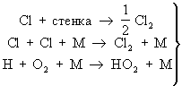 В последних двух стадиях М — любая третья частица (атом или молекула), которая нужна для того, чтобы отнять часть энергии у образующихся частиц Cl2 и HO2 и тем самым сделать невозможным их обратный распад.