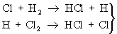 Неразветвлённые Ц. р. Химические процессы с неразветвлёнными цепями можно рассмотреть на примере фотохимической реакции между водородом и хлором. В этой Ц. р. молекула хлора, поглощая квант света, распадается на два атома. Каждый из образовавшихся атомов хлора начинает цепь химических превращений; в этой цепи атомы хлора и водорода выступают в качестве активных частиц. Длина цепи может быть очень большой — число повторяющихся элементарных реакций продолжения цепи на один зародившийся активный центр может достигать десятков и сотен тысяч. Обрыв цепей происходит в результате рекомбинации атомов в объёме реактора, захвата атомов его стенкой с последующей рекомбинацией на стенке, образования неактивного радикала при реакции активных центров с молекулами всегда присутствующих примесей [например, при реакции между атомарным водородом и молекулами кислорода (примесями) с образованием радикала HO2; этот радикал в условиях не очень высоких температур не реагирует с исходными молекулами].
