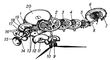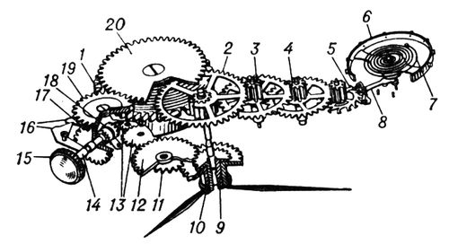 Рис. 5. Схема механизма наручных механических часов: 1 — заводной барабан; 2, 3, 4 — основная зубчатая передача; 5 — спусковое колесо; 6 — баланс; 7 — спираль; 8 — анкерная вилка; 9 — триб минутной стрелки; 10 — часовое колесо; 11 — триб вексельного колеса; 12 — вексельное колесо; 13 — переводные колёса; 14 — заводной вал; 15 — заводная головка; 16 — переводной и заводной рычаги; 17 — заводной триб; 18 — кулачковая муфта; 19 — заводное колесо; 20 — барабанное колесо.