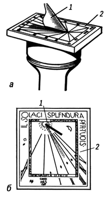 Рис. 1. Солнечные часы: а — горизонтальные; б — вертикальные; 1 — стержень (пластина), тень от которой служит указателем времени на циферблате 2.