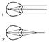 1 — параллельные лучи собираются в фокус впереди сетчатки; 2 — расходящиеся лучи собираются в фокус на сетчатке.