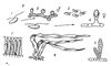 Рис. 3е. Чередование поколений у зелёной водоросли ульвы: 1 — зооспора; 2 — + гаметофит; 3 — + гамета; 4 — — гаметофит; 5 — — гамета; 6 — копуляция гамет; 7 — молодой спорофит; 8 — взрослый спорофит; 9 — таллом спорофита в разрезе.