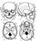Рис. 5. Череп человека: а — вид спереди; б — вид сбоку; в — внутреннее основание черепа; г — наружное основание черепа; 1 — лобная кость, 2 — теменная кость, 3 — клиновидная кость, 4 — слёзная кость, 5 — скуловая кость, 6 — верхняя челюсть, 7 — нижняя челюсть, 8 — подбородочное отверстие, 9 — сошник, 10 — нижняя носовая раковина, 11 — подглазничное отверстие, 12 — решётчатая кость, 13 — носовая кость, 14 — височная кость, 15 — надглазничное отверстие, 16 — затылочная кость, 17 — нёбная кость.