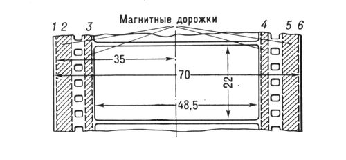 Размеры позитивного кадра советской системы широкоформатного кино: 1—6 — дорожки фонограммы.