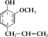 Эвгенол, 1 - окси - 2 - метокси - 4 - аллилбензол, желтоватая жидкость с запахом гвоздики, растворимая в спирте, эфире, ограниченно — в воде; tпл 10,3 °С, tkип 252,7 °C, плотность 1,066 г/см3(20 °С).