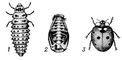 Рис. 1. Семиточечная божья коровка: 1 — личинка; 2 — куколка; 3 — жук.