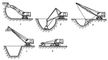 Рис. 2. Схемы многоковшовых экскаваторов: а — неповоротный цепной на железнодорожном ходу с боковой разгрузкой; б — то же однопортальный; в — поворотный цепной на гусеничном ходу; г — роторный; д — цепной, траншейный; е — цепной отвальный.
