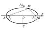 ). Э. — линия второго порядка; она симметрична относительно осей AB и CD; точка О — центр Э. — является его центром симметрии; отрезки AB = 2a и CD = 2b называются соответственно большой и малой осями Э.; число е = с/а<1 — эксцентриситет Э. (при е = 0, то есть при а = b, Э. есть окружность). Прямые, уравнения которых x = —а/е и х = а/е, называются директрисами Э.; отношение расстояния точки Э. до ближайшего фокуса к расстоянию до ближайшей директрисы постоянно и равно эксцентриситету. Точки А, В, С, D пересечения Э. с осями Ox и Оу называются его вершинами. См. также Конические сечения.