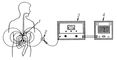 Рис. 1. Схематические изображения принципа работы радиотелеметрической системы для исследования функций пищеварительного тракта: 1 - радиопилюля в желудке; 2 - приемная антенна; 3 - радиоприемник; 4 - регистратор.