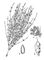 Эфедра хвощевая, ветвь цветущего пестичного растения; а — тычиночный колосок (собрание микростробилов); б — семезачаток со стерильными кроющими чешуями; в — семя.