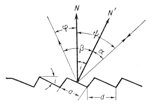 Схематическое изображение участка поверхности эшелетта и хода лучей, падающих на него и дифрагирующих на нём: а — ширина зеркальной грани штриха; d — постоянная эшелетта; N — нормаль к общей поверхности эшелетта; N' — нормаль к зеркальной грани штриха («угол блеска»); y — угол падения лучей на эшелетт; j — угол дифракции; a — угол падения лучей на зеркальную грань штриха; b — угол дифракции от зеркальной грани штриха.