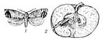 Яблонная плодожорка: 1 — бабочка; 2 — разрез яблока с гусеницей.