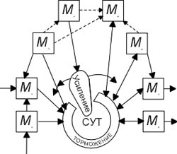 Модели образов и действий М1, М2, М3... М8, имеющие связи между собой, еще имеют связи с системой усиления-торможения, по которым они сигнализируют об уровне своей активности.Система усиления - торможения на каждый момент выбирает самую активную модель и дополнительно ее усиливает, а все другие - соответственно тормозит. В следующий момент обязательно происходит переключение на другую самую активную модель.