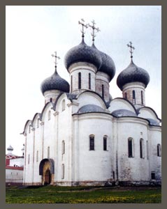Софийский собор – шестистолпный трехапсидный храм с двумя ярусами окон (рис. 1). Его позакомарная кровля увенчана пятиглавием. Исследователи древнерусской архитектуры ставят его в ряд особенно значительных шестистолпных пятиглавых кафедральных соборов Московской Руси, восходящих к общему для них образцу – Успенскому собору Московского Кремля. Размеры храма: кафаликон (основной объем, без апсид): 31,65x25 м, высота до сводов – 38,4 м; высота с крестом – 50,65 м.