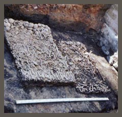 Другим открытием стало обнаружение в раскопе массового захоронения человеческих останков. Кости располагались в двух крупных (2x1,5 м и 2x1,2 м) и нескольких небольших могильных ямах. Характер расположения костей, при котором основная масса черепов была сконцентрирована в «западной» части погребений, основная масса костей ног – в «восточной», а прочие кости рассредоточены по остальной площади могильной ямы, не оставляет сомнения в том, что найденное погребение представляет собой перезахоронение более раннего погребального комплекса. Проведенные антропологические исследования показали, что общее количество погребенных составляло около 280 – 300 субъектов, причем соотношение полов и возрастов погребенных характерно для типичных средневековых кладбищ русских городов. Скорее всего, найденные останки происходят с кладбища приходской церкви, застроенного в XVII или XVI в. при работах по сооружению масштабного Архиерейского дома или же самого собора (рис. 2).