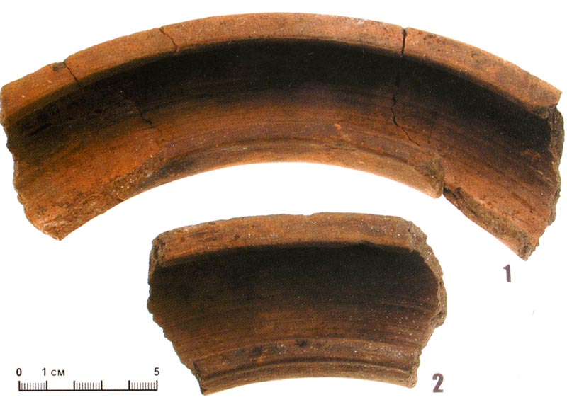 Во втором шурфе, заложенном в 7,5 м выше по течению реки, исследована материковая яма, в которой сохранился деревянный опечек и пол из досок вокруг него (рис. 6). Возможно, это остатки одной из кузниц, располагавшихся по берегам реки в XVII в. Об этом свидетельствуют находки инструментов и предметов кузнечного производства: подкова, колун, клещи, точильный круг (рис. 7, 5, б). Назначение керамического желоба(?) (рис. 8), фрагменты которого найдены под деревянным настилом, остается загадкой. Возможности датировки слоев предоставляют найденные медные монеты. Из 7 монет точно установить дату можно у трех: 1736 (деньга), 1797,1801 (2 копейки). Культурный слой на данном участке представляет собой достаточно влажный суглинок, хорошо сохраняющий дерево, кожаные и берестяные изделия. Здесь