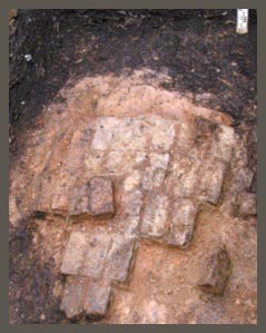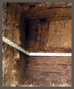 В ходе работ в шурфах установлено, что максимальная мощность культурного слоя на данном участке превышает 5 метров (рис. 3)! Верхняя свита напластований (до 1,1 м) насыщена строительным и бытовым мусором XX в. Ниже залегает пласт светло-желтого суглинка, возможно, выброс грунта из фундаментного рва Рыбных рядов. В данном слое в шурфе 1 зафиксированы остатки деревянных конструкций и кирпичной печи (рис. 4), датируемые по монетным находкам XVIII в. Ниже располагалась деревянная конструкция «на выносах», представляющая собой, возможно, остатки моста, некогда существовавшего в устье р. Золотухи (по «Переписи города Вологды 1685 года»).