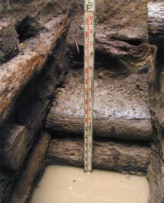 В нижней части шурфа, на глубине более 4,5 м от поверхности, расчищены засыпанные глиной ряжевые деревянные конструкции (рис. 5), появление которых можно связать с работами по укреплению берегов Золотухи в период существования крепости.