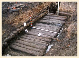 работами в траншее на ул. С. Орлова, 3-б. Выявлена и расчищена мостовая XVIII века.