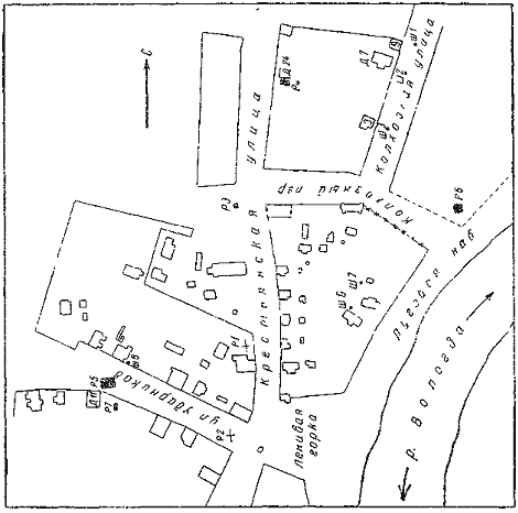 До XV в. нельзя говорить о значит иной величине города. Только в XVI в. он начал разрастаться в районе Ленивой горки и дальше, но даже и в это время о« не представлял единого целого: наличие построек на Луговой набережной и отсутствие их выше, непосредственно в черте города, свидетельствуют об этом.