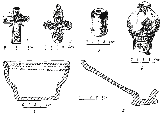 Рис. 38. Керамические изделия и кресты из раскопок в Вологде: 1, 2—кресты-тельники; 3—обломок балясины, 4—черная лощеная чашка, 5 — грузило, 6 — профиль миски.