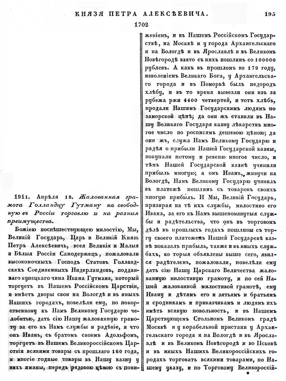 Жалованная грамота голландцу Гутману на свободную в России торговлю и на разные преимущества