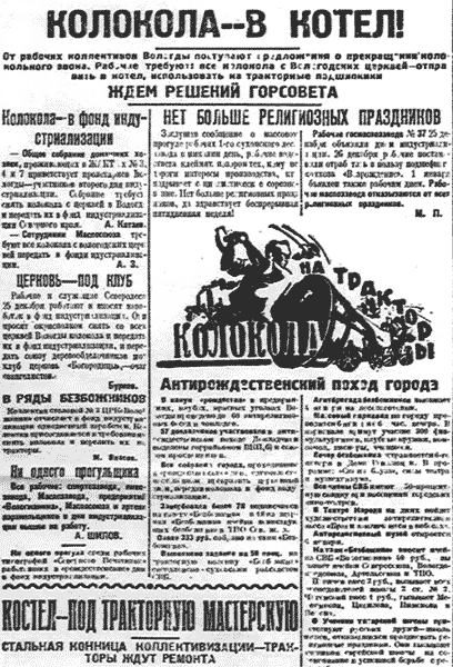Мы не сомневаемся, что все рабочие вологодских предприятий не пойдут на удочку попов и различных кликуш, 7 и 8 января они будут стоять у своих станков и машин, сильнее крутя и двигая ими». |